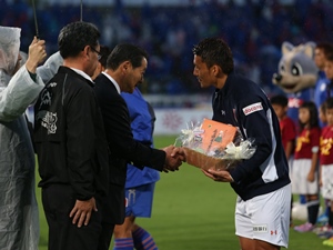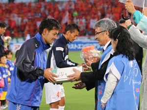 阿部選手がこの試合でJ通算100試合出場を達成し、フォーレちゃんから花束の贈呈が行われました。