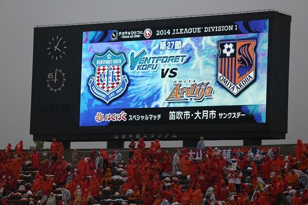 戦前の予想通り、両チームとも絶対に負けられない戦いは「まずは守備から」という印象を受ける入り方になる。ピッチコンディションがスリッピーなこともあり、お互いにリスクをを冒さない攻撃が続きチャンスを作ることが出来ない。甲府は、チーム全体で高い意識の守備を見せボールを奪い、素早い攻撃に切り替えていきたいところだが前線にボールが収まらずに攻撃の厚みを生み出す事が出来ない。大宮はズラタンにボールを収め、ゴールに迫ろうとするものの崩しきる事が出来ないまま0-0で前半を終える。