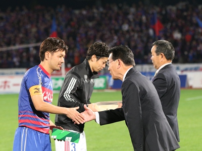 シチズン電子(株)代表取締役社長 郷田 義弘 様より甲府に対し「カラフルな色使いとデザインが楽しめる、シチズンQ&Qスマイルソーラー」をシチズンセイミツ(株)代表取締役社長 石綿 修一 様よりFC東京に対し「正確なときを刻み続ける、シチズン電波掛時計」をそれぞれ贈呈していただきました。