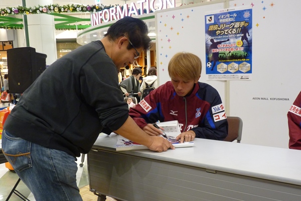 このイベントはJリーグトップパートナーの「イオン」様が全国のグループ店舗において、Jリーグ各クラブの試合をショッピングセンターで観戦するパブリックビューイングや、サッカー教室、選手と地域の皆さまとのふれあいイベントなどサッカーを核に地域を盛り上げる取り組みの一環で行われました。